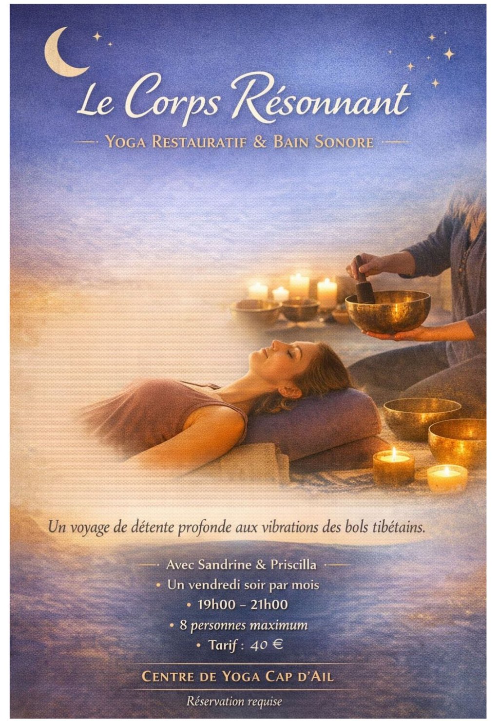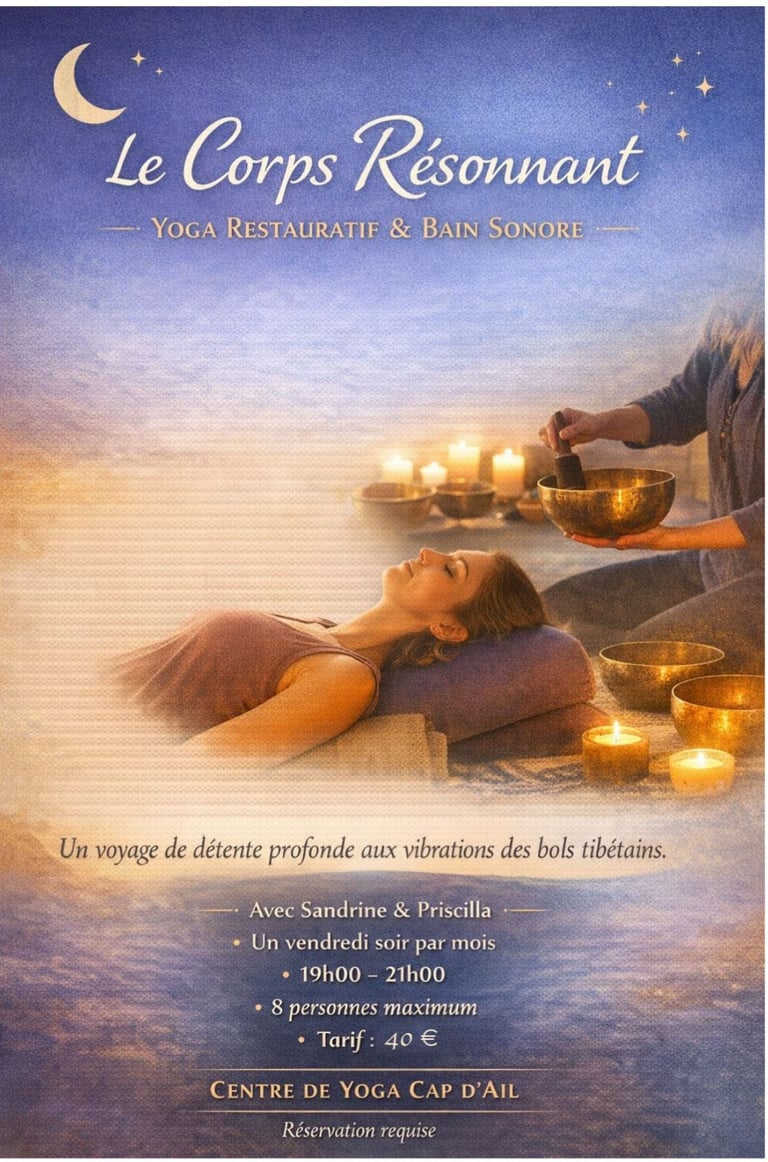 Guidés par Sandrine, enseignante de yoga, et Priscilla, praticienne du son, vous serez accompagnés dans une expérience douce, enveloppante et profondément régénérante.