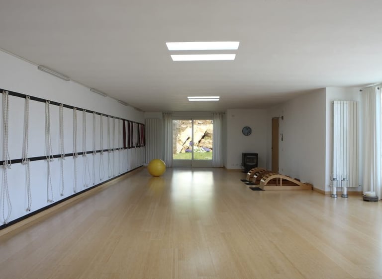 • Une salle de yoga lumineuse et spacieuse, ouverte sur la nature, avec vue sur les collines et les villages alentour.